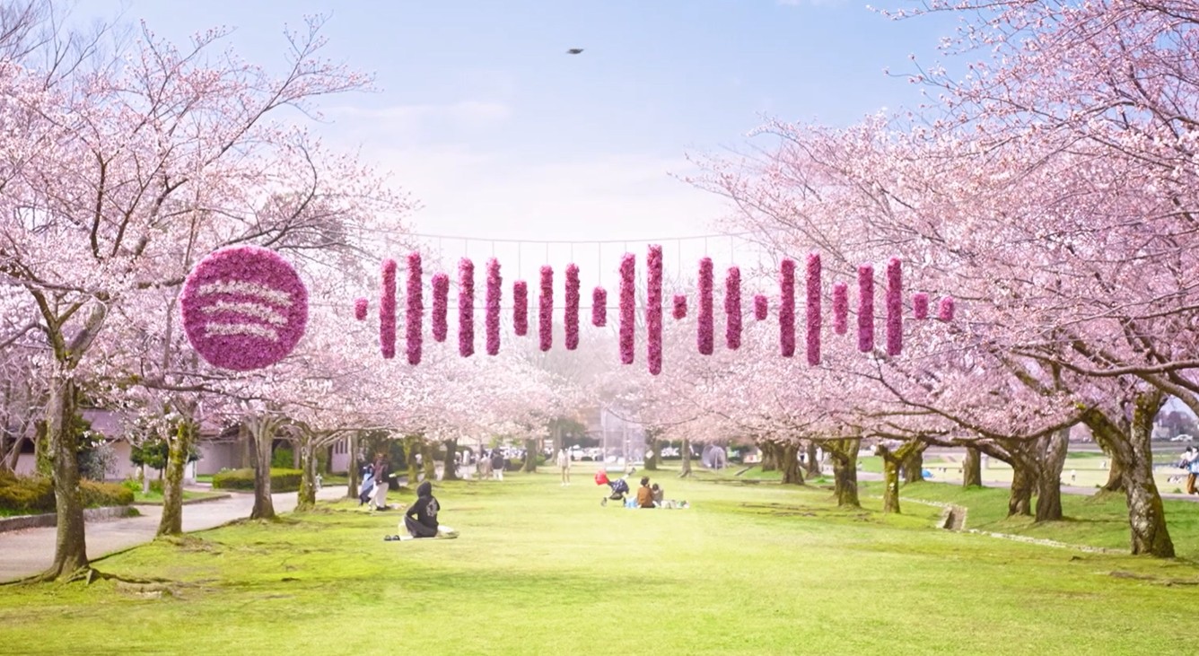 有“小京都”之称的金泽,当然少不了成片的樱花长廊。一进入赏樱季节,犀川河边就有长达几百米的樱花热烈盛放。于是,第二个Spotify code便落在樱花林间。它由两种颜色的樱花花瓣制成,用于纪念这个短暂而烂漫的季节。在绿草蓝天之间,有一种不言而喻的融入感和美感。