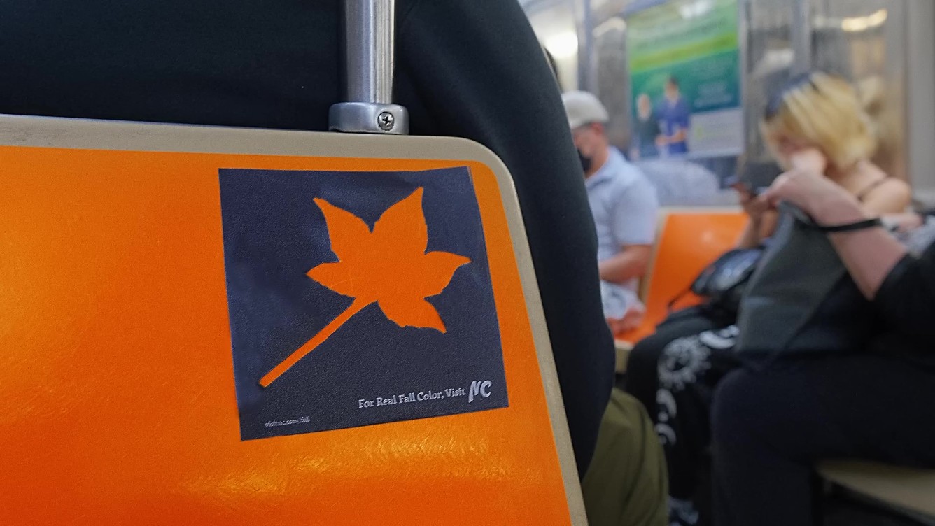 “For Real Fall Color, Visit NC”,欣赏真正的秋色,到北卡罗来纳吧。创意工作室Luquire为北卡罗来纳旅游局打造的这场宣传,用简单的镂空树叶贴纸、薄磁片,在纽约街头为人们制造了一场“秋色大赏”。红墙、黄椅、橙色垃圾桶……都成了这一campaign的展场,“海报”所到之处,秋天的感觉也就悄悄来了。